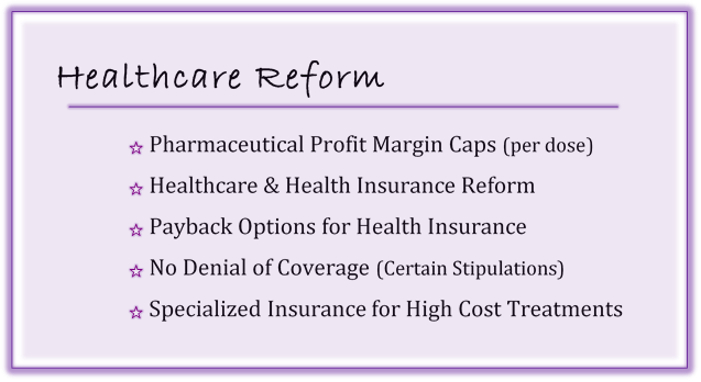 Healthcare Reform is based on lowering individual premiums and prescription costs by establishing regulations for health insurance and pharmaceutical companies.